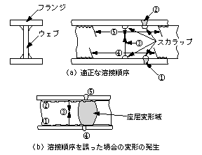 図1(b)のように、すみ肉から溶接し、フランジの溶接を最後にすると、フランジが溶接変形しようとしてウェブをはさんで押すため、座屈変形する恐れがある。