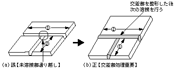 複数の溶接継手で構成された溶接構造物は、溶接順序が大切である。熱変形、拘束による変形および残留応力による溶接欠陥のでない順序にする。たとえば、収縮変形をなるべく自由端に逃がすため、中央から自由端に、下から上へ組み上げる。また溶接変形(仮付片面だけに溶接が凝固、収縮するために生じる反り)を少なくするために、溶着量の多い部分から先に溶接する。たとえば図1のようなI形ガーダを現場溶接する場合、フランジ相互の突合せを先に、ウェブの突合せを次に、最後にウェブとフランジのすみ肉を行う。著しい拘束応力を避けるため、図2のように全長多層溶接せず、溶接部分を分け、それぞれを表面まで個別に仕上げる。また図3のような溶接では、未溶接継手を通り越しての溶接は避けて、溶接欠陥を防止する。参考文献:「溶接・接合便覧」溶接学会編、「溶接技術の基礎」溶接学会