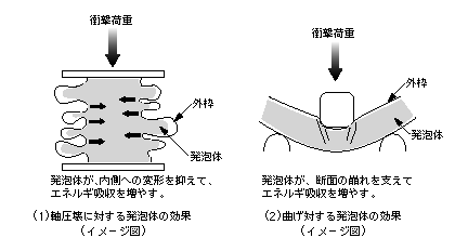 車体骨格構造は、図1のような閉断面の柱や梁で構成されている。この閉断面の中に充填材を封入し、衝突エネルギの吸収量を増加することが検討されている。実験の結果、ウレタン系などの発泡体を充填するとエネルギ吸収性が優れることが判明した。発泡体の軸圧壊に対する効果、曲げ圧壊に対する効果をイメージ図として、図2に示す。この構造を加えることで、鋼板の板厚を薄くすることができ、その質量軽減効果は20%から25%にもなる。