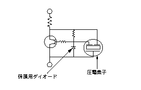 電素子は機械的衝撃により、数10Vの高いサージ電圧が発生するので、圧電素子の近傍にはサージ吸収用のダイオードやコンデンサを入れて、トランジスタやICの破壊を防止する。