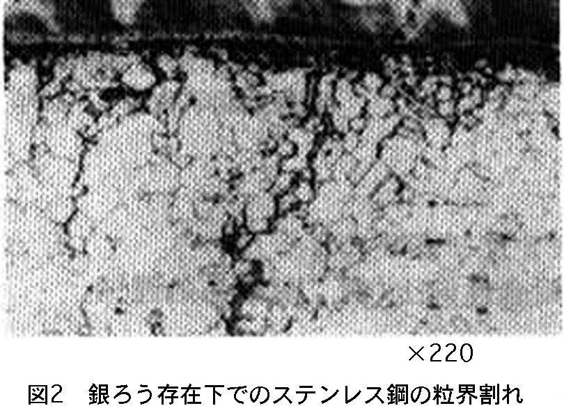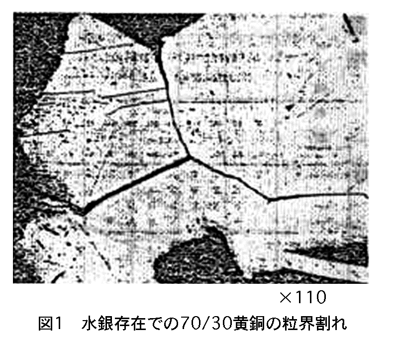 固体金属が液体金属と接触しているとき、引張または剪断応力で脆性破壊することがある。脆性は、液体金属が表面から結晶粒界に拡散浸透し、金属化合物を作るためである。一般に、破壊は塑性変形した後に、残留応力や外的応力で、主応力軸に対して直角方向に発生する。また結晶粒度が大きい程、負荷速度が大きいほど、低い応力で破壊する。図は脆性破壊の事例である。参考資料:(1)金属の割れ破損(経営開発センター出版部)(2)材料強度工学ハンドブック(朝倉書店)