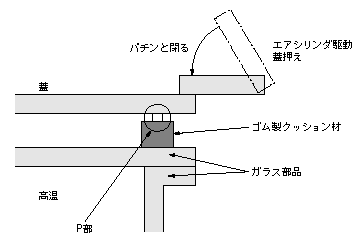 図は、エアシリンダでガラス製の蓋を上から押さえ、塩素雰囲気ガスを保持する構造を示す。蓋をする際、ガラス部品が衝撃で割れるのを防ぐため、クッション材としてシリコンゴムを先端に取付けた。しかし高温で、このシリコンゴムが硬化してしまいクッション材として機能しなくなった。対策として、耐熱温度の高いフッ素ゴムに変更した。