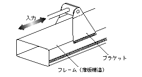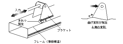 図1のように、ブラケットが薄板構造の車体フレームに溶接されていた。試作車両のテストでフレームの溶接近くに亀裂が発生した。剛性の低いフレームに溶接したのだが、ブラケットに加わる力によって、図のようにフレームが局部的に曲げ変形し、早期に疲労破壊を起こした。対策として、図2のように、溶接位置を剛性の高いフレーム側面に変更し、曲げ変形を避けた。