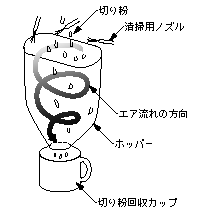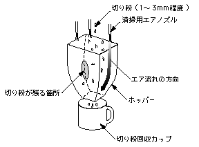 図1のような、分析装置の切り粉を回収する装置で、切り粉が完全に回収されなかったため、分析精度が低下した。ホッパの角部に切り粉が残り、次の試料に混入したためであった。対策として、図2のように、ホッパ角部を丸型とし、清掃用エアの吹き出し方向を変更した。