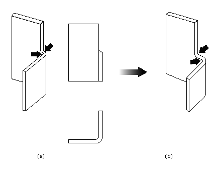 ブラケットに亀裂が発生した。図の(a)のように、亀裂はブラケットのアール部に発生し、疲労破壊が生じていた。亀裂部は、素材の溶断アール部と板の曲げアール部とが重なった場所で、プレスによる皺が見られた。この剛性急変部が疲労破壊の起点になっていた。対策として、図(b)のように、両者のアール部を分離した。