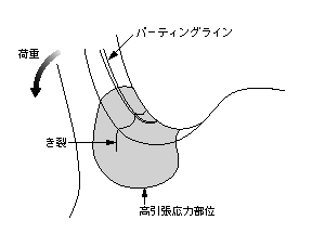 試作車の耐久試験で、鋳物車体部品に亀裂が発生した。調査したところ、図のように、鋳物のパーティングライン(型の合わせ目)にできるバリ部分が、疲労破壊のクラックの起点となっていた。パーティングラインによるバリは通常、グラインダで削除するが、この時の亀裂部位では工具が入りにくいので削除できず、しかも荷重によって高引張応力が働き、疲労してしまった。
