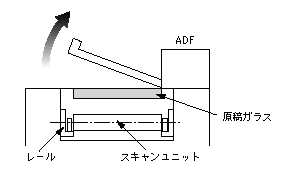 複写機の試作機で、デバックをしていたところ、自動原稿送り装置(ADF:Auto Document Feeder)にセットされた原稿が次々と送りこまれ、原稿詰まりが発生した。これを解除するために、図のように、ADFを持ち上げたところ、複写機が誤動作した。最初の、ADFに強制的に原稿が送り込まれた不具合は、制御ソフトのバグが原因で、この不具合によって、ADFの原稿を送るベルトと原稿ガラスとがこすれて、静電気が発生した。その結果、ADFを持ち上げた際に、原稿ガラスが高電位になり、近くの原稿読取用のスキャンユニットに放電し、さらに金属製のレールにも放電し、ノイズが制御基板に伝わり、制御ソフトの不具合の誤動作が発生したと考えられる。対策として、ADFのソフトウェアのバグを修正するとともに、制御用基板の耐ノイズ性を向上した。