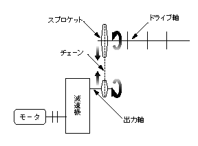 ドライブ軸をチェーン駆動したところ、市販減速機の出力軸ベアリングが破損した。図のように、減速機出力軸から動力伝達を直角に行うので、軸にねじりと曲げの合成力がかかり、それが、減速機の許容オーバーハング力を超えたことが原因であった。対策として、減速機を1サイズ大きくした。