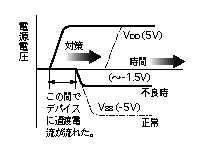 複数電源を有する半導体デバイスの基板を、図1のように、電源に接続したところ、システム電源が立ち上がらず作動不良となった。電源接続で、まずVDD(正電源)、次にVSS(負電源)が投入されるシーケンスとなっていた。しかし、図2のように、正電源投入でデバイスに過渡電流がながれ、負電源投入時に電源電圧が-1.5Vと、所定の-5Vまで立ち上がらなかったことが原因であった。対策として、負電源を先に投入する電源投入シーケンスに変更した。
