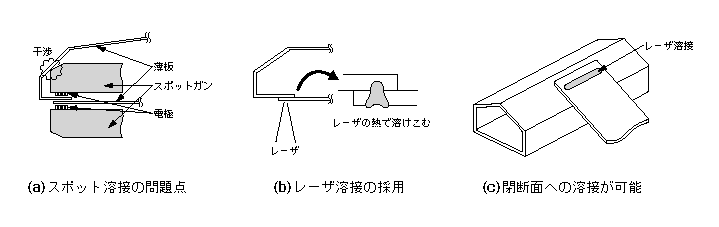 スポット溶接は、2つの電極で2枚の薄板を挟んで接合する。このため、スポットガンのスペースの確保が部材形状の制約となっていた(図(a))。これに対して、接合する薄板の1枚の面から行えるレーザ溶接を採用すれば、そのスポットガンスペース確保の制約から開放されるだけでなく(図(b))、これまで不可能とされていた閉断面への部材溶接も可能となる(図(c))。