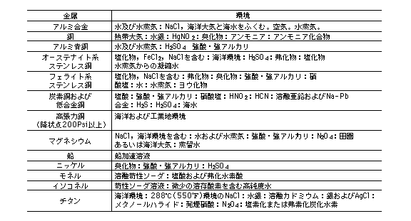 アンモニア中での黄銅のSCC(応力腐食割れ),塩化物水溶液中でのオーステナイト,ステンレス銅やAl合金のSCC,アルカリ水溶液中でのアルカリ脆性が代表的である。