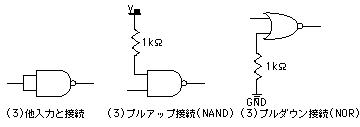 CMOS の入力ピンは、未接続(フローティング)の状態としない。CMOS の入力インピーダンスは非常に高いため、ほんの少しのノイズでもフローティングの入力を一時的にHIGHに変えて、誤動作の原因となる。したがって、未使用ピンは未接続とせず、図の例のように適切な処置をおこなう。