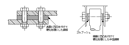ボルト締結構造の不具合として、ゆるみの他、被締結体のすべりに起因するものがある。例えば図1のように、位置決めを目的とした締結構造の場合、すべりを防ぐためには、接合面の摩擦力の増大が有効である。図2に、摩擦係数の増大策の例を示す。(参考文献:「ねじ締結概論」酒井智次著、養賢堂)
