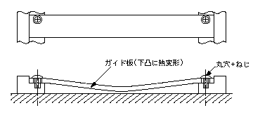 複写機の検査工程で、連続コピーテスト中30〜50コピーで紙詰まりの不具合が発生した。一旦停止して数時間放置すると、復帰する現象もみられた。原因調査すると、熱定着後の紙は、ガイド板に沿って移動するが、コピー紙の熱でABS樹脂のガイド板が90℃まで上昇して、図1のように、熱膨張・変形して、紙の通過通路を塞いだことが原因であった。対策として、図2のように、ガイド板の一方を固定とし、他方をフリーとする段付きネジ+長穴として、熱膨張を逃がす構造に変更した。