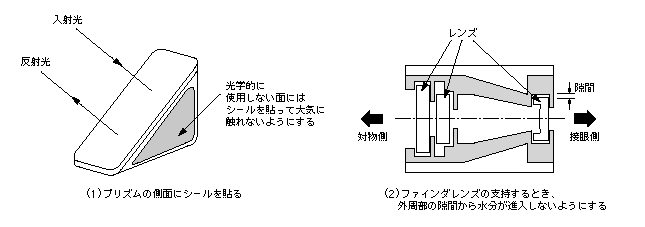 (1)プリズムの両面にシールを貼って防湿する。(2)ファインダレンズの外周部の隙間から水分が進入しないようにする。ごみの進入も防ぐ。