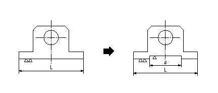 比較的大きな軸受を設計する時は、底面の接地面積を最小限にして、仕上げ加工面積を小さくし、加工コストの低減を図る。図は、底面を全面▽▽加工から、中央部を▽加工してへこませるように変更した例である。なお、底面の最小接地面積は、面圧を検討して決定する。