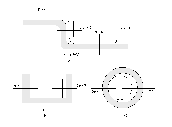 装置本体に取り付けるプレートを設計した。図(a)のように、まずボルト1を締め、次にボルト2、最後にボルト3を締めようとしたが、機能上接触すべき部位に隙間が発生してしまった。設計する際は、締結面は2面以下となるよう注意する。
