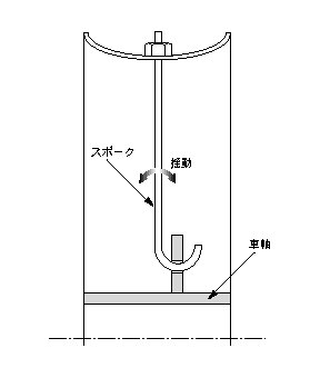 車輪のスポークのような細くて長い構造は、圧縮荷重で容易に坐屈する。座屈を防ぐため、図のように、一端を揺動可能な構造にする。また、予め大きな引張荷重を与えて、外力が作用しても軸力が圧縮にならないようにする方法も有効である。