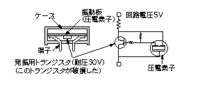 電素子は機械的衝撃により、数10Vの高いサージ電圧が発生するので、圧電素子の近傍にはサージ吸収用のダイオードやコンデンサを入れて、トランジスタやICの破壊を防止する。