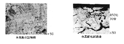 タフピッチ銅には酸素が含まれており、水素を含む雰囲気中で加熱すると、次の反応式で蒸気を生成する。Cu2O + H2 → 2Cu + H2O 生成水蒸気は内部圧となり、気孔が発生し、粒界付近での金属の割れを促進する。図はタフピッチ銅の水素脆化試験前後の比較である。参考資料:金属便覧(日本金属学会編)