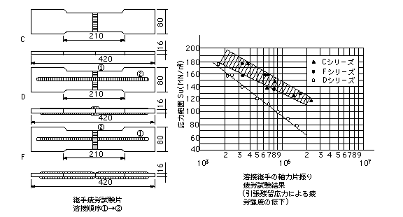 自己平衡的に発生する。この残留応力は、溶接割れ、応力腐食割れの主原因となり、脆性破壊を助長させ、脆性破壊の遷移温度を上昇させ、疲労強度の低下も促進する。図は、試験片の溶接継手部の残留応力が異なると(C,F:5kg/mu、D:25kg/mu)、大きいものほど疲労強度が低下することを示す。参考資料:IIW.DOC.XV-436-66(1966)