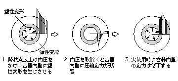 高圧用円筒内壁に圧縮の残留応力を導入することで容器内壁の応力集中を緩和する。