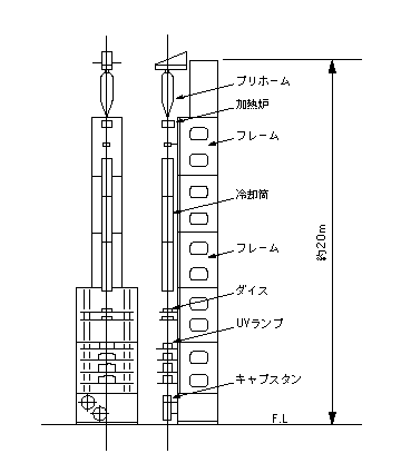 光ファイバの線引(せんびき)機は、図のようにフレームを数段積みにした縦長の構造であり、かつ重量物である。各フレームの作業面側には、ヒータ、ダイス、焼付炉等のファイバ加工装置が組み付けられ、各装置のファイバ通過部は、同一軸に組立られる必要がある。従来、各段の作業面の位置合わせは、フレーム加工後、仮組みして行い、確認後ノックピン加工していた。しかし、高さが足りずに段組立できる作業場がなく、仕方がないので、分割して仮組みすることが多く、時間と労力がかかっていた。今回、隣接するフレームをボルトで固定し、ノックピンを施した後、2つのフレームの作業面を同時加工した。次にその作業面を基準にもうひとつ隣のフレームの作業面を機械加工し、全フレームの作業面の位置出しが順にできるようにした。この方法で、仮組み確認を省いて現地組立が可能となった。
