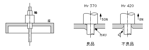 部品の座に部品の軸を圧入し、生じたカエリで両者を固定した。ところが、硬度Hv350以上と書いて設計したので、熱処理後のベリリウム銅がHv420と硬くなりすぎた。その結果、カエリが脆化して脱落し、通常の1/6と小さな力で軸が抜けてしまった。対策として、Hv350±50に管理して硬化しすぎないようにした。