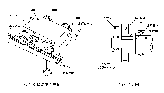 重量物の搬送設備を設計したが、荷重を受けるための車輪と、静止位置精度を向上させるためのピニオンとを、直径が少し異なるにもかかわらず、同軸に取り付けてしまった。つまり、車輪がピニオンより直径が大きいので、外周端の周速が大きくなるが、ピニオンとラックはすべらないので常に車輪とレールとの間ですべりが生じていた。しかし、加減速の時に、車輪に大きな密着力が働くので、車輪とピニオンとの間の車軸にねじり応力が働いた。その上、車軸は段付き部分のギリギリまでキー溝が切ってあったため、最後には応力が集中するキー溝部から車軸が破断してしまった。