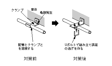 トランスミッションの戻り配管のクランプが、油圧脈動や走行時の路面からの振動で、破損した。図のように、配管はクランプに溶接し、クランプを通して車体に固定されていた。組立時、溶接するために配管を無理に引っ張って固定したため、クアンプには引張応力が働いていたが、それに加えて無理に取り付けられて発生した初期応力に、振動で繰り返し荷重が働いたことが原因である。対策として、クランプ溶接をUボルトの固定に変更し、クランプの板厚も増加した。