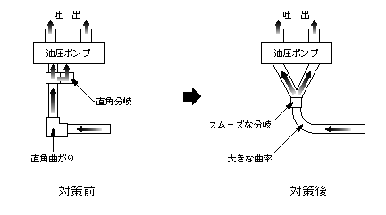 作業機ポンプでキャビテーションが発生した。図のように、吸込み側の配管が直角曲がりで、かつ油圧ポンプ入口での分岐が直角のため、吸込み側配管の抵抗が大きく、吸込み圧が許容値以下となったことが原因であった。