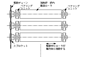ガラスの製造工程で、加熱炉内のガラス搬送ローラが軸方向に揺動した。図のように、ローラの両端はベアリングユニットで支持されているが、両端ともフリーになっていた。また、駆動チェーンがスプロケットを介して、ローラを回転する。ベアリングとローラのはめあいがゆるすぎ、ローラは軸方向に自由に動くことができたので、チェーンとスプロケットのガタやスプロットケット間の平行度の違いが原因となって、ローラが揺動した。対策として、駆動チェーン側のベアリングでローラの軸方向の動きを固定した。