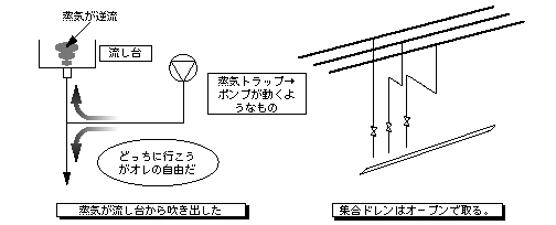 設備の蒸気配管のトラップ式ドレンを、図のように、一般排水系に接続したところ、流し台から蒸気が噴出した。流し台から蒸気ドレン接続までの距離が長く、使用蒸気量が少ないので、一般排水に接続したが、蒸気にヘッド(圧力)があり、逆流した。供給配管はヘッドを持つので、集合ドレンは右図のように、大気圧にオープンした構造として、背圧の発生を避ける。