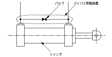 油圧配管を新設し、運転開始したが、シリンダの動作が安定しなかった。配管組立て時作動油内に混入したエアが原因であった。末端のシリンダに、図のようなバルブ付きのバイパス管を設けて、配管組立て時、エア抜きが容易にできるようにした。