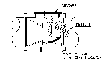 密閉された設備の中で、定期的点検や部品交換を行う場合、交換部品以外の周辺機器を取り外さないような作業方法が好ましい。図1で、ダンパーコーン部品は、摩耗によって定期的に交換するが、交換の際、ピン抜き作業で作業時間がかかる。そこで、図2のように、ダンパーとコーン部とを分離し、使用時はボルト結合しておくが、交換時はをコーン部(実際は円板状)のみをはずし、交換作業の容易化を図った。