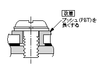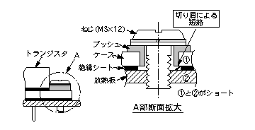 電子機器で動作不良が多発した。調査の結果、絶縁しているはずのパワートランジスタのケースと放熱板とに導通がみられた。図1のように、ねじを締め付けするとき、アルミの放熱板のねじ加工で発生する切り屑やバリが挟まり、トランジスタのケースと放熱板とが短絡していた。対策として、図2のように、ブッシュのスカート長を長くし、絶縁シートの穴径を小さくし、ねじの切りくずが入り込まない構造とした。