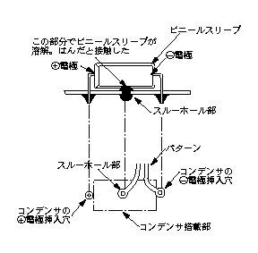 両面基板組立で、はんだ層加工後の動作チェックで回路不良が多発した。図のように、両面基板表面の電解コンデンサ実装部の真下にスルーホールがあった。はんだ層加工で裏面から押し込まれて上がってきたはんだが、コンデンサの絶縁スリーブを溶かし、電極のボディとパターンが短絡した。対策として、パターンを変更し、スルーホールの位置をコンデンサの下から移動した。