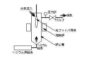 光ファイバ母材のガラス化は、図のように、多孔質で不透明な母材(スートと呼ぶ)を炉心管内に入れ、ヘリウムガス雰囲気中で1400℃以上に加熱し、透明化する工程である。炉心管内の圧力変動で、管内に大気が流入し、ガラス内に気泡が混入した。
