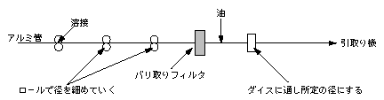 アルミ管の製造で、管径を所定の径にするため、ダイスを通す工程がある。この工程で、管の破断が発生した。ロールで管径を細める際に発生するバリが、ダイスに焼き付いたことが原因であった。図のように、ダイスの前段にフィルタを設け、バリを除去した。
