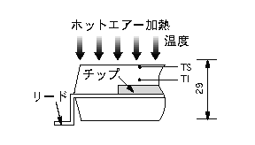 電子機器が作動不良となった。調査の結果、半導体チップにクラックが発見された。この半導体パッケージは、図のように、基板にリフローはんだ付けで実装されている。この時は、ホットエアーの急激な加熱によって、パッケージ内に過渡的な温度差TS-TIが生じ、その結果、熱応力が発生するが、その熱応力がクラックの原因であった。なお、リフローはんだ付けとは、基板上にはんだ印刷を行い、部品を搭載したあとに加熱してはんだを溶かし、はんだ付けする実装方法である。