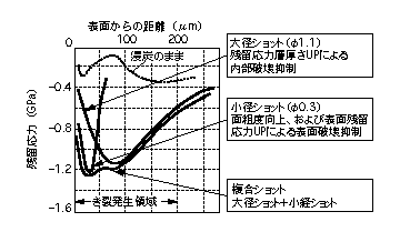 大径ショットによる深い残留圧縮付与と、小径ショットによる表面粗さの改善という、2つのショット条件を使い分けたことで、2つの要求を満足できた。ショットピーニングの機能を明確に分けたことで、新しい工法が得られた例である。