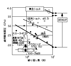 車両の軽量化と高トルク化のニーズで、駆動歯車の高強度化が求められる。駆動歯車の歯面強度改善には、表面から100μm程度深くはいった位置が剪断応力が最大になるのだが、その内部から壊れる内部起点破壊と表面粗さやスクラッチに依存する表面起点破壊との両者を考慮する必要がある。このとき、粒径の異なる2種のショットピーニングを施す複合ショットピーニングを実施すると、歯面疲労強度の大幅な改善が可能となる。具体例として、ショット径φ1.1mmでショット後に、φ0.3mmのショットを施した。図1のように、表面から200μmの深さまでの残留圧縮応力と、表面粗さRz1.6〜5.0μmとの両方が実現できた。この結果、図2のように、浸炭のままに比べ、95%以上の大幅な疲労強度向上が図れた。