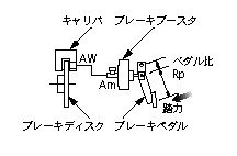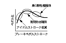 従来のブレーキシステムでは、システムレバー比は車両重量に応じて、ペダル踏み込み初めから終わりまで一定であった。ブレーキシステムのレバー比とは、図1のように、ペダル比および油圧シリンダ面積比で踏力を増加させる比率で、Rp・Aw/Am で表される。ここで、Aw:キャリパのシリンダ面積、Rp:ペダル比、Am:マスタシリンダの面積、である。さらに、ブレーキ踏力はシステムレバー比とブレーキブースタ助成力で強められ、タイヤとともに回転するブレーキディスクを挟む荷重を発生する。RVやSUVと呼ばれるレジャー用自動車では、車両重量が大きく、ブレーキの効きを確保するには、システムレバー比を大きくする必要がある。すると、ブレーキストロークが大きくなり、乗用車と同様のフィーリングを得ることができなくなる。そこで図2のように、ブレーキペダルリンクをダブルリンク式にすることで、ペダル踏み込みでリンクが回転し、作用角の変化でシステムレバー比が変化する。図3に、その特性を示す。ブレーキ常用域ではレバー比を大きくし、ブレーキの効きを高め、さらに効きが高い領域では、徐々にレバー比を低くすることで剛性感を与え、アイドルストロークではレバー比を押さえた。このようにして、ブレーキの効きと踏み込みのフィーリングの両方を向上できた。