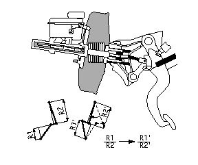 従来のブレーキペダルに、単にリンクを追加することで、レバー比を可変にできた。