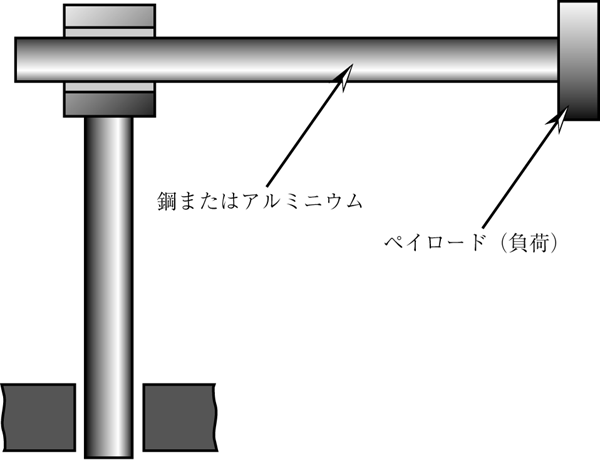回転型のロボットの関節は,相互に排他的な機能を果たさねばならない(図1)。駆動モーターを小形化し、かつ/または、より大きなペイロード(負荷能力)を得るために、アームは(与えられた形状に対して)軽量でなければならない。しかし 、軽量な素材は一般に十分な剛性(ヤング率)が得られない。一方、アームの先端の変形を減らし、起動/停止時の安定時間を短くするためにアームの剛性は高くなければならない。しかし、剛性の高い素材は一般に重い。 物理的矛盾は、「アームは軽量でなければならないが、重く(高剛性で)なければならない」ことである。ここで、簡単な分析により、アーム先端の変位は、アームの付け根の部分(曲げモーメントが最大で、突起長さが最大)により決まる。一方アームの慣性モーメントは主に張り出し部分により決まる(図2)。したがって、対立する要求が空間で分離されている。したがって、この物理的矛盾は、アームを二つの部分で構成すれば解決できる。アームのモーメントにあまり大きく影響しないが、その剛性を決定づける付け根の部分を高いヤング率を持つ材質(たとえば鋼)で構成する。一方、剛性にはさほど影響しないがモーメントを決定づける突出部分を軽量にする(たとえばアルミニウムを使う)。 (参考文献:実際の設計研究会編「TRIZ入門」日刊工業新聞社)