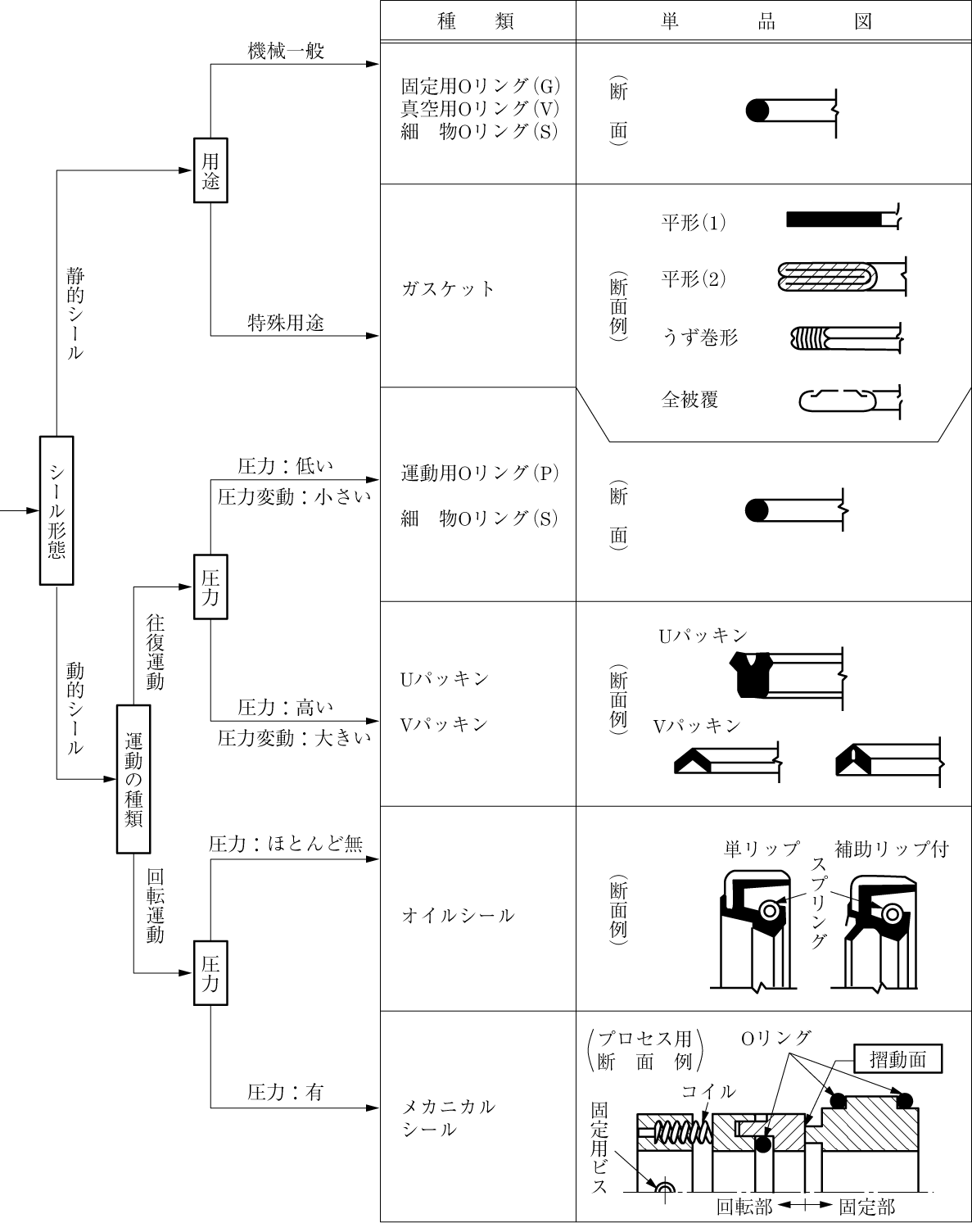 シール機能をもつ機構要素として、Oリング、ガスケット、Uパッキン、Vパッキン、ダストシール、オイルシール、メカニカルシールなどがある。その中でOリングが特に広く用いられる。