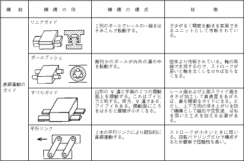 並進運動をガイドする機構として、リニアガイド、ボールブシュ、レールガイド、リンクなどがある。中でも多種多様な市販品が存在する、リニアガイドやボールブシュが広く用いられている。しかし、物体を送るときの振れを小さくしたい時は、すべりガイドを用いる。きさげ加工で摺動面を仕上げると、0.1μm/200mmという真直度も得られる。
