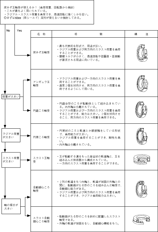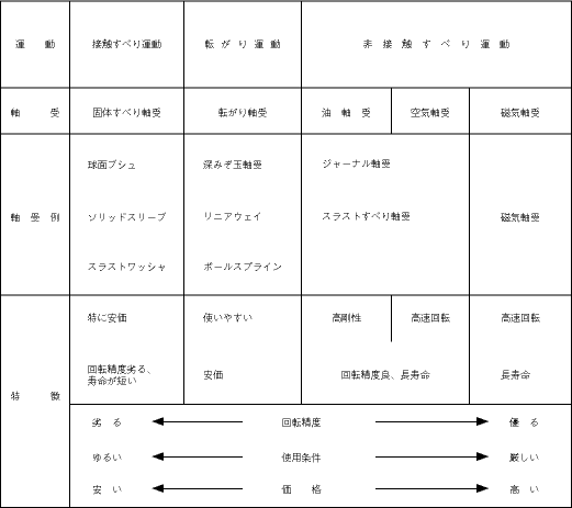 軸受の機能は、相手部品の位置決め、相手部品が及ぼす反力の支持、必要な方向に対する運動の拘束である。大きく分けて軸受には、転がり運動をする玉軸受ところ軸受と、滑り運動をする滑り軸受の2通りがある。後者はさらに、メタルブシュやプラスチック軸受のように接触式のものと、油軸受、空気軸受、磁気軸受のように非接触式のものがある。軸受の設計には、安価で入手しやすい玉軸受をまず検討するのが妥当である。要求機能がそれほど厳しくなければすべり軸受の接触式を用いる。油軸受は荷重が大きく寿命も長く必要な場合に用い、回転数が高いときは空気軸受や磁気軸受を検討するとよい。しかしこれらは非常に高価なため注意を要する。