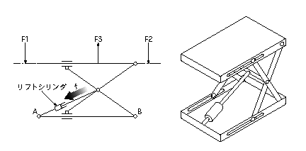 テーブルリフタは、折りたたみができるうえにコンパクトなため、重量物の上下移動の機構としてよく使われる。しかしテーブルリフタを使う場合、荷重位置や荷重方向の条件のうち、ある条件では機能しないことがある。たとえば図に示すように、F2(B点より外側の位置に動く)やF3(テーブルが引き上げられる方向に動く)の荷重が働くときにこれを保持することができない。なぜならば、リフトシリンダが油圧で保持できる方向の力fと逆の方向に力が作用し、リフトシリンダ内の圧力が負圧になってしまうためである。常にfの方向に力が作用するように、荷重の方向・位置を設定する必要がある。とたえば図のF1はA点より外側であるが、fの方向と同じ方向に力が働き、荷重を支持できる。