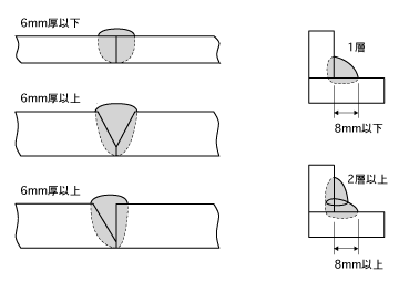 厚板で溶接構造物を組む場合、一般的に、板厚6mm未満では開先(かいさき)無しの突き合わせ溶接でもよいが、溶接の品質確保のために6mm以上では開先継手にすることが望ましい(図1)。また、隅肉溶接では溶接脚長8mmまでは1層盛りで行い、8mm以上から2層以上に盛る。サブ組みした溶接物を総組みして本溶接する場合、サブ組同士の継ぎ部の隙間管理が困難なことがある。隙間(図2のルート間隔)が大きい部位を溶接すると、表面的には設計通りに接合されているように見えても、内部にブローホールやアンダーカットなどの欠陥が発生しやすい。このような箇所で溶け込み品質を確保するため、バックアッププレートを用いて、溶接の吹き抜けや溶け込み不良を防止することが望ましい(図2)。また大きな力が作用し高応力が発生する箇所には、断続仮付け溶接ではなく、バックアッププレートを用いた連続溶接にする方がよい(図3)。これは、断続仮付け溶接部に応力集中が発生することを防ぐためである。